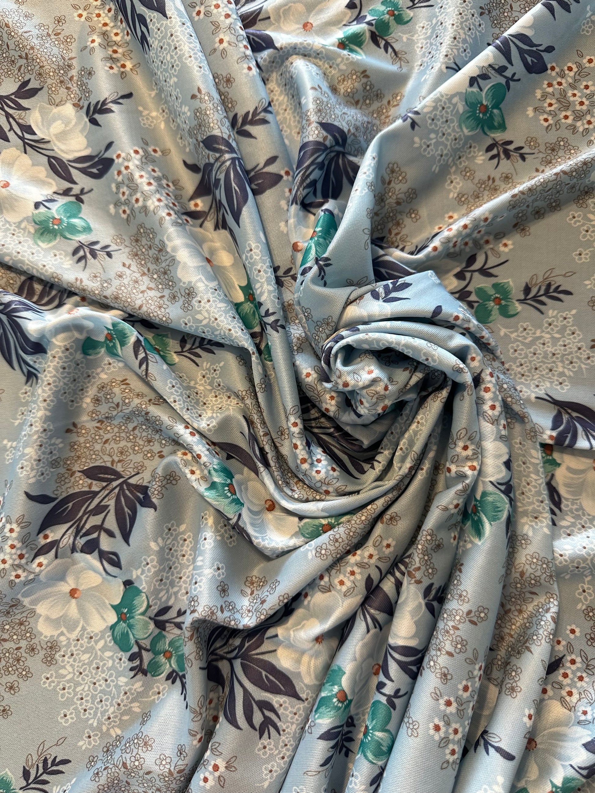 63” x 2 yards of Light Blue Poly Satin Knit with Dark Blue, White, Turquoise and Bronze Florals